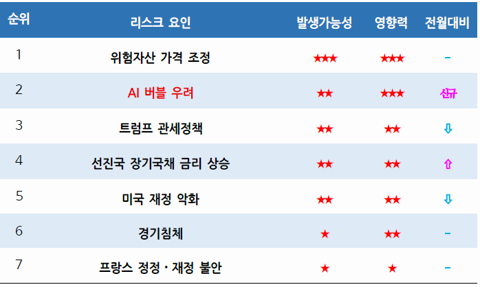 주:① ‘트럼프 관세정책’은 현행ㆍ추가 관세와 對美투자 압박 상황, ‘경기침체’는 글로벌 성장률이 2% 초반 이하로 하락하는 경우, ‘선진국’은 美,英,獨,佛,日. AI 버블 우려는 시장 다수 의견이 될 경우.