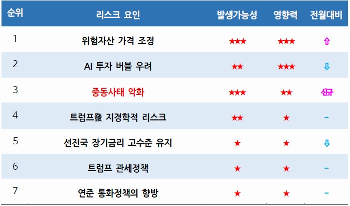 ㅁ 전월까지는 ‘트럼프發 지경학적 리스크’에 이란 이슈를 포함시켰으나 전쟁 발생 으로 글로벌 유가, 금융시장, 거시경제 등에 직접적 영향을 미치는 요인으로 상향됨에 따라 ‘중동사태 악화’ 가능성을 신규 리스크로 추가