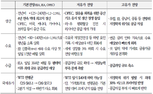 ㅁ ['26년 전망] 원유 공급과잉 확대로 국제유가는 팬데믹 이후 가장 낮은 수준을 기록할 전망. 약세 리스크가 시장 전면에 부각 시 일시적으로 $40대로 하락 후 반등 가능성
